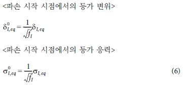 계산된 등가 변형률을 다음의 식 (5) 관계를 이용하여 각 파손모드에서의