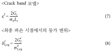이러한 연구들 외에, PFA에서 mesh 민감도를 감소시키기 위하여 손상변수에 재료의 파괴에너지를 접목시킨 사례들이 있다. Lapczyk 등[8]은 손상변수에 crack band (CB) 모델[9]의 파괴에너지와 재료의 변위 관계를 이용하여 적은 mesh 민감도를 가지는 손상변수 모델을 제시하였다.