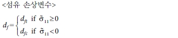 (damage variable)을 이용하여 구현한다. 손상변수는 손상의 정도가 커짐에 따라 최대 1의 값까지 커지게 되며, 이 변수는 재료의 강성행렬을