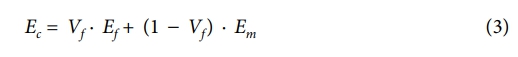 여기서 Ec는 복합재의 탄성계수, Vf는 섬유의 부피분율, Ef는 섬유의 탄성계수, Em은 매트릭스의 탄성계수이다. 혼합법칙을 통해 이론적으로 계산한 CFRP와 GFRP의 탄성계수는 각각 실험값 대비 36%, 45%의 오차를 보였다. Ansys ACP로 얻은 물성치는 혼합법칙과 유사한 결과를 보였으며, 실험값과 각각 4%, 10%의 차이를 나타냈다. 반면, Digimat을 활용한 RVE 해석에서는 기공 및 섬유 직경과 같은 미세구조를 반영한 결과, CFRP와 GFRP의 탄성계수가 실험값과 각각 1%, 3%의 오차율을 보였다. 이는 실험값에 가장 근접한 결과로, 미시구조 해석이 복합재 물성 예측에 있어 높은 신뢰성을 가지는 방법임을 확인할 수 있었다. 이러한 결과는 Fig. 3과 Table 3에 제시되어 있으며, 다양한 해석 방법에 따른 복합재 물성의 차이를 확인할 수 있다.