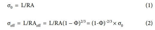 1차원 전기전도 경로를 따라 측정된 전기저항과 시편의 치수로부터 식 (1)과 같이 전기전도도를 구할 수 있다. 그러나 일반적인 고상 물질과 달리 스펀지는 다공성이기 때문에 식 (2)와 같이 기공률을 고려한 유효전기전도도를 도출해야 한다[17].
