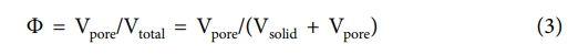 여기서 σ는 전기전도도, L은 길이, R은 전기저항, A는 면적, Φ는 기공률, 그리고 밑첨자 eff는 유효를 나타낸다. 즉, 유효전기전도도 σeff는 식 (1)에서 유효면적 Aeff를 대입한 것인데, 기공률은 부피에 비례하기 때문에 유효면적은 결국 2/3 제곱에 비례한다. 따라서. 식 (2)와 같이 정리되고, 기공률(Φ)은 스펀지 업체에서 제공해준 데이터시트 값(96.6%)을 사용하여 유효전기전도도를 계산했다. 또한, 압축에 따라서 기공률은 변화하기 때문에 식 (3)을 통해서 압축 조건 별 기공률을 계산했다.