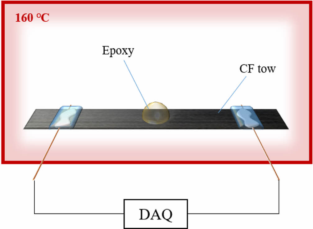 탄소섬유와 수지 간의 젖음성을 평가하기 위해 수지 젖음성 테스트를 수행하였다. 수지 젖음성은 탄소섬유와 수지 간 계면 특성에 크게 영향을 미치며, 복합소재 제조 시 공정성을 평가하기 위해 진행되었다. Fig. 1에서 에폭시 수지의 함침성 평가시험을 확인할 수 있다. 12,000 가닥의 탄소섬유 다발(길이 30 mm)을 스카치테이프로 유리판에 고정하고, 구리선과 실버페이스트를 이용해 20 mm 간격으로 전극을 형성하였다. 전극 고정을 위해 에폭시 접착제를 사용하여 60oC의 건조오븐에서 1시간 동안 경화하였다.