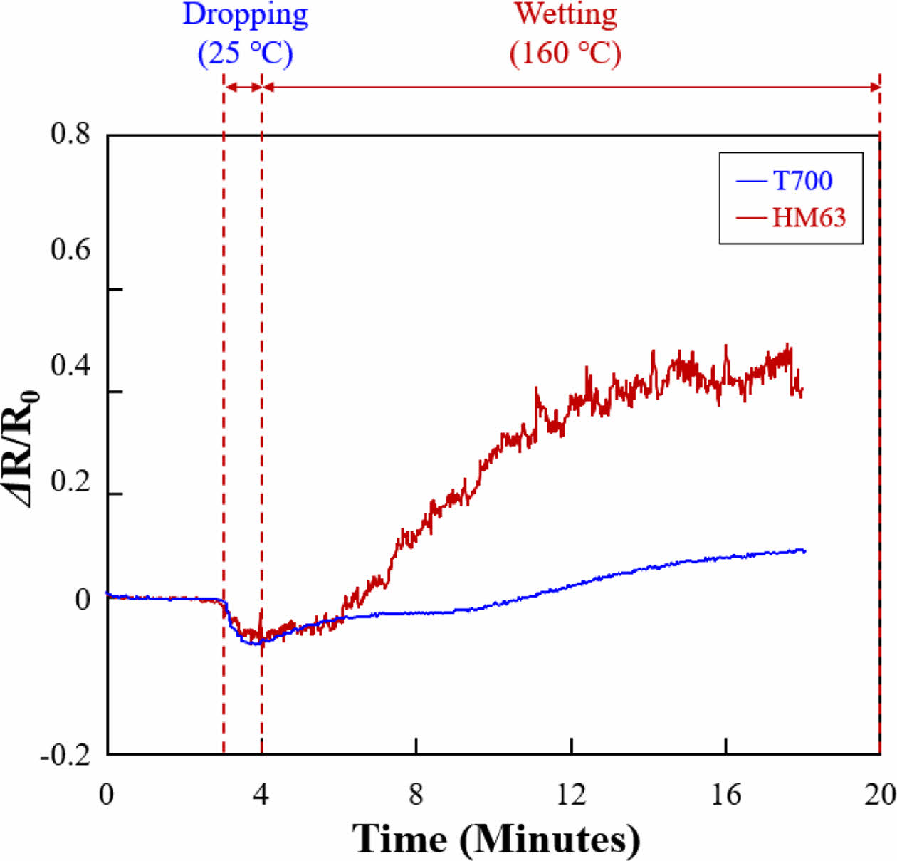 Fig. 7은 전기저항을 활용하여 서로 다른 탄소섬유와 에폭시 수지의 함침성을 평가한 결과를 보여준다. 초기 에폭시 드롭을 올림에 따라 전기저항이 일시적으로 감소하게 되고, 이후 시간이 지남에 따라 두 탄소섬유 모두 전기저항이 점진적으로 증가하는 경향을 나타냈다. 이는 에폭시 수지가 탄소섬유 사이로 함침되면서 섬유 간 간격이 벌어져 탄소섬유 간의 계면 저항이 증가한 것으로 해석된다. 또한 탄소섬유 내 에폭시 수지가 함침됨에 따라, 에폭시 수지가 탄소섬유를 밀어내고 탄소섬유에 장력이 발생하게 된다. 이에 따라 탄소섬유의 전기저항 또한 증가하게 된다. 섬유 내 수지가 빠르게 함침되면 이에 따른 전기저항 또한 빠르게 증가할 수 있다.
