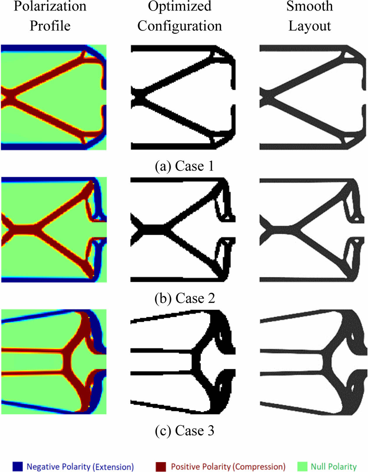 모든 수치 예제에서 페널티 계수 Puu와 Puf는 각각 3과 4로 설정되었으며, 이는 선행연구 결과를 바탕으로 선정되었다[11]. 목표 재료 부피는 0.3으로 설정되었으며, 위상 최적화 결과는 Table 2에 요약되어 있다. 또한, Fig. 3은 위상최적화의 결과로 도출된 분극 프로파일, 재료 밀도, 및 매끄러운 경계 레이아웃을 보여준다.