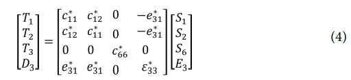 열 결합(thermal coupling)을 무시하고 압전 구성 모델에서 평면 응력(plane stress)을 가정하면, 이러한 상호 작용을 지배하는 일반적인 구성 방정식은 식 (3)으로 표현할 수 있다[16].