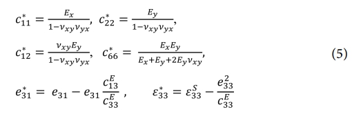 본 연구에서는 평면 응력 구성 방정식을 사용하여 압전 재료의 이방성 거동을 모델링하였다. 일반적으로, 일반적으로, 식 (4)에 나타난 압전 구조의 평면 응력 성분은 3차원 구성요소로부터 다음과 같이 유도될 수 있다: