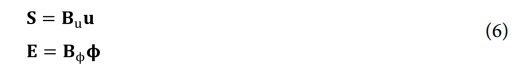 변형률-변위 행렬(Bu)과 요소 기울기 행렬(Bf)의 값을 사용하여, 전기장과 변형률은 다음과 같이 표현될 수 있다.