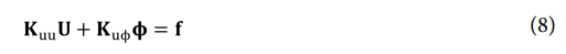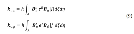 이 방정식은 가해진 전기 포텐셜에 의해 발생하는 기계적 변위를 계산하는 데 사용된다. 식 (8)의 성분들은 식 (9)를 이용하여 다시 정리할 수 있으며, 보다 자세한 유한요소 정식화는 선행연구를[11] 통해 참고할 수 있다.