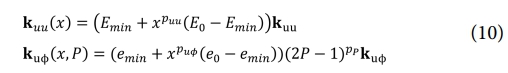 여기서 x는 요소별 재료 밀도를 나타내며, 값은 0에서 1까지 범위를 가진다. E0와 e0는 최대 밀도(x=1)에 해당하는 재료 특성을 나타내며, Emin과 emin과 같은 작은 값은 각각 강성 행렬(stiffness matrix)과 결합 행렬(coupling matrix)에서 시스템의 비정상적 상태(ill-conditioning)를 방지하기 위해 도입된다. 본 논문에서는 이러한 최소 값을 emin=Emin=10-9 [7,11]로 설정하였다. P는 분극 변수(polarization variable)로 값이 0과 1 사이에 있으며, 분극 방향을 결정한다. puf , puf , pp는 각각 강성, 결합 행렬, 그리고 분극 값에 대한 페널티 계수(penalization coefficient)를 나타낸다.