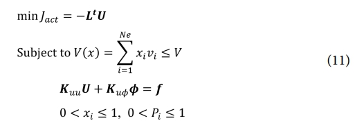 압전 액추에이터 설계를 위한 최적화 문제 정의는 식 (11)로 표현된다. 기존 접근법[16]에 기반하여, 평면 압전 액추에이터의 최적화 과정은 목적 함수 Jact를 최소화함으로써 구조의 특정 위치에서 최대 변위를 달성하는 것을 목표로 한다.