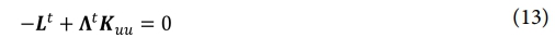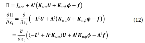 여기서 L는 유한요소 형태에서 선형 운동량 보존의 지배 방정식을 고려하는 라그랑지 승수(Lagrange multiplier)를 의미하며, 수반 방정식(adjoint equation)은 식 (13)으로 유도된다.