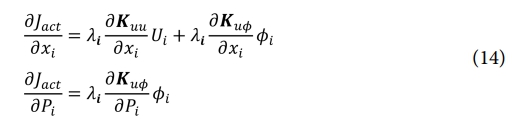 식 (13)에서 제시된 수반 방정식(adjoint equations)은 자기수반(self-adjoint)하지 않으며, 각 반복(iteration)마다 해를 구해야 한다. 그러나 LU 분해 및 Cholesky 분해와 같은 표준 분해 방법을 사용할 수 있으므로 이 과정에서 계산 효율성에는 큰 영향을 미치지 않는다. 따라서, 목적 함수의 민감도는 다음과 같이 계산된다.