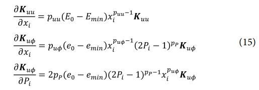 여기서 λi는 전역 수반 벡터 Λ의 요소 형식(elemental format)을 나타낸다. 설계 변수에 대한 압전 강성 행렬(piezoelectric stiffness matrix) 및 결합 행렬(coupling matrix)의 미분은 식 (10)을 사용해야 하며, 그 결과는 다음과 같이 표현된다.