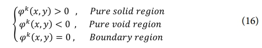 이번 섹션에서는 매끄러운 경계를 가지는 최적화 구조를 얻기 위해, 요소 기반 설계 변수 θk를 매끄럽게 표현하기 위해 연속변수로 전환한다. 이상적으로 설계는 고체 또는 공극 상태로 구성되며, 이때 θik는 {0,1} 값을 갖는다. 매끄러운 경계를 가진 최적화된 위상을 나타내기 위해, 요소 밀도 θik는 전체 설계 영역에서 보간되어 θk(x, y)를 형성한다. 이후, 투영 함수(projection function) φk(x, y)=θk(x, y)-th가 정의되며, 이 함수를 통해 최적화된 위상이 해당 함수의 제로 컨투어(zero contour)로 표현된다[18].