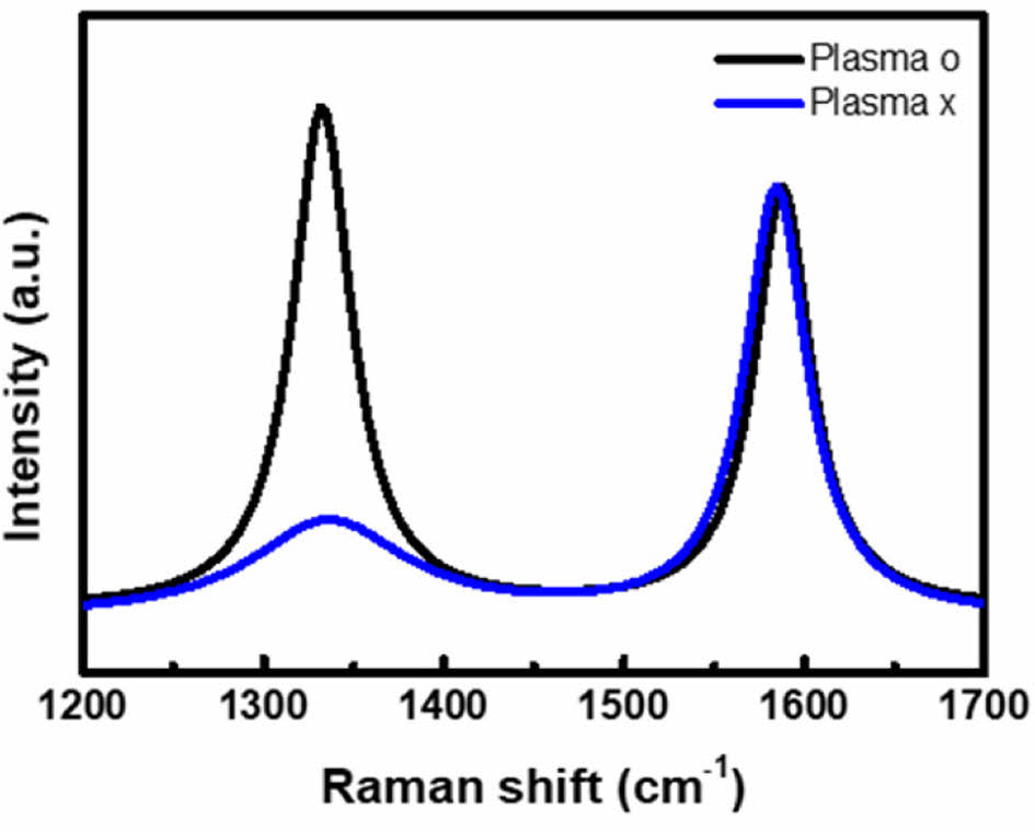 본 연구에서는 알루미늄과 탄소가 결합을 형성하는데 목적을 두고 있다. 그러나 탄소나노튜브가 가지는 특성 중 소수성은 알루미늄과의 젖음성을 약화시켜 두 이종소재를 이용한 복합재를 제조할 경우 치명적인 결함을 야기시킨다. 이를 해결하기 위해 표면에 산소 플라즈마 처리를 진행하여 소수성의 탄소나노튜브 시트를 친수성으로 변환하였다. Fig. 1은 라만 분광법을 통해 얻은 탄소나노튜브 시트의 플라즈마 처리 전, 후 결과이다. 그래프를 관찰한 결과 플라즈마 처리 전에 비해 플라즈마 처리 후 D peak의 count가 증가한 것을 확인하였다. 탄소나노튜브 표면에 관능기가 형성될 경우 D peak이 증가한다는 연구결과는 많이 알려져 있다. 이를 통해 플라즈마 처리 후 탄소나노튜브 시트 표면에 흘려준 산소에 의한 산소 관능기가 형성된 것을 알 수 있다.