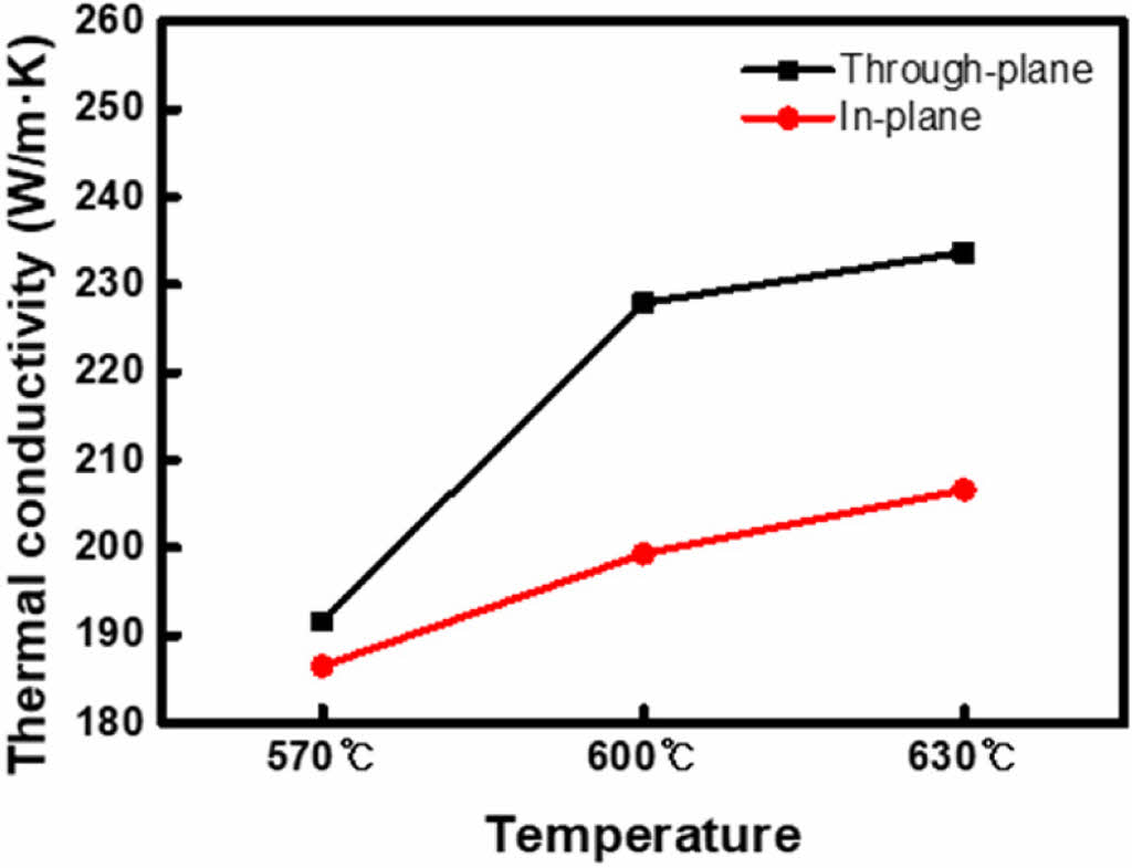 Fig. 3 Thermal conductivity of sintered aluminum at 570oC, 600oC, and 630oC |
