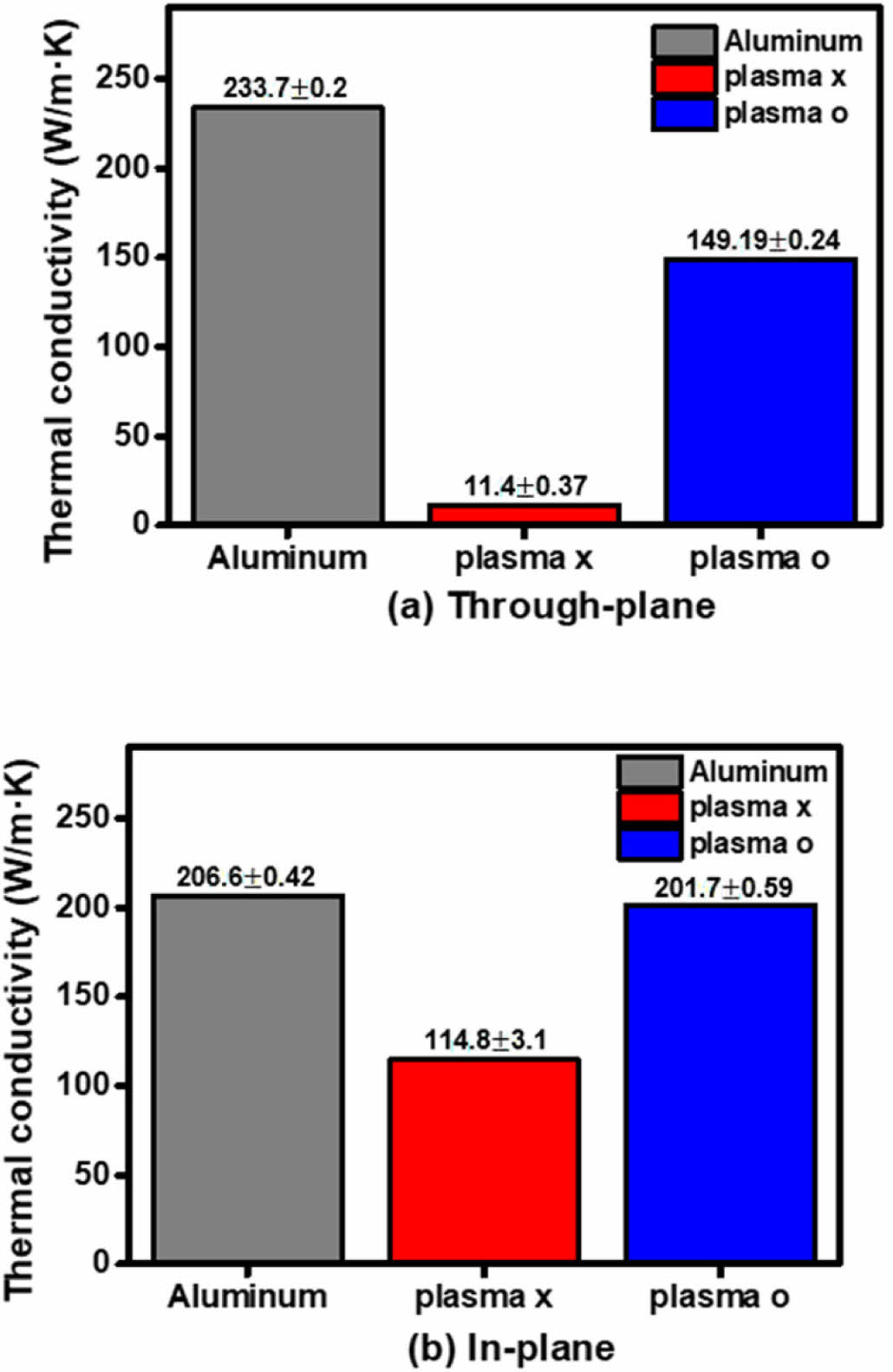 그러나 순수 알루미늄 소결체와 플라즈마 처리 전 탄소나노튜브 시트를 이용한 복합재를 비교한 결과 전체적인 열전도도가 감소하였다. 이는 소수성의 성질을 갖는 탄소나노튜브 시트가 알루미늄과 결합이 형성되지 않기 때문이다. 플라즈마 처리 후 탄소나노튜브 시트를 이용한 복합재의 through-plane 열전도도는 149.19 W/mK, in-plane 열전도도는 201.7 W/mK를 갖는다. 앞선 결과와 같이 탄소나노튜브 시트로 인해 이방성의 열전도도를 갖는 것을 확인하였다. 또한 플라즈마 처리 전 탄소나노튜브 시트를 이용한 복합재와 비교하였을 때 열전도도가 증가한 것을 알 수 있다. 이는 앞선 산소 플라즈마 처리에 의해 탄소나노튜브 시트 표면이 친수성의 성질을 갖고 이를 통해 알루미늄과 젖음성이 향상되었기 때문이다.