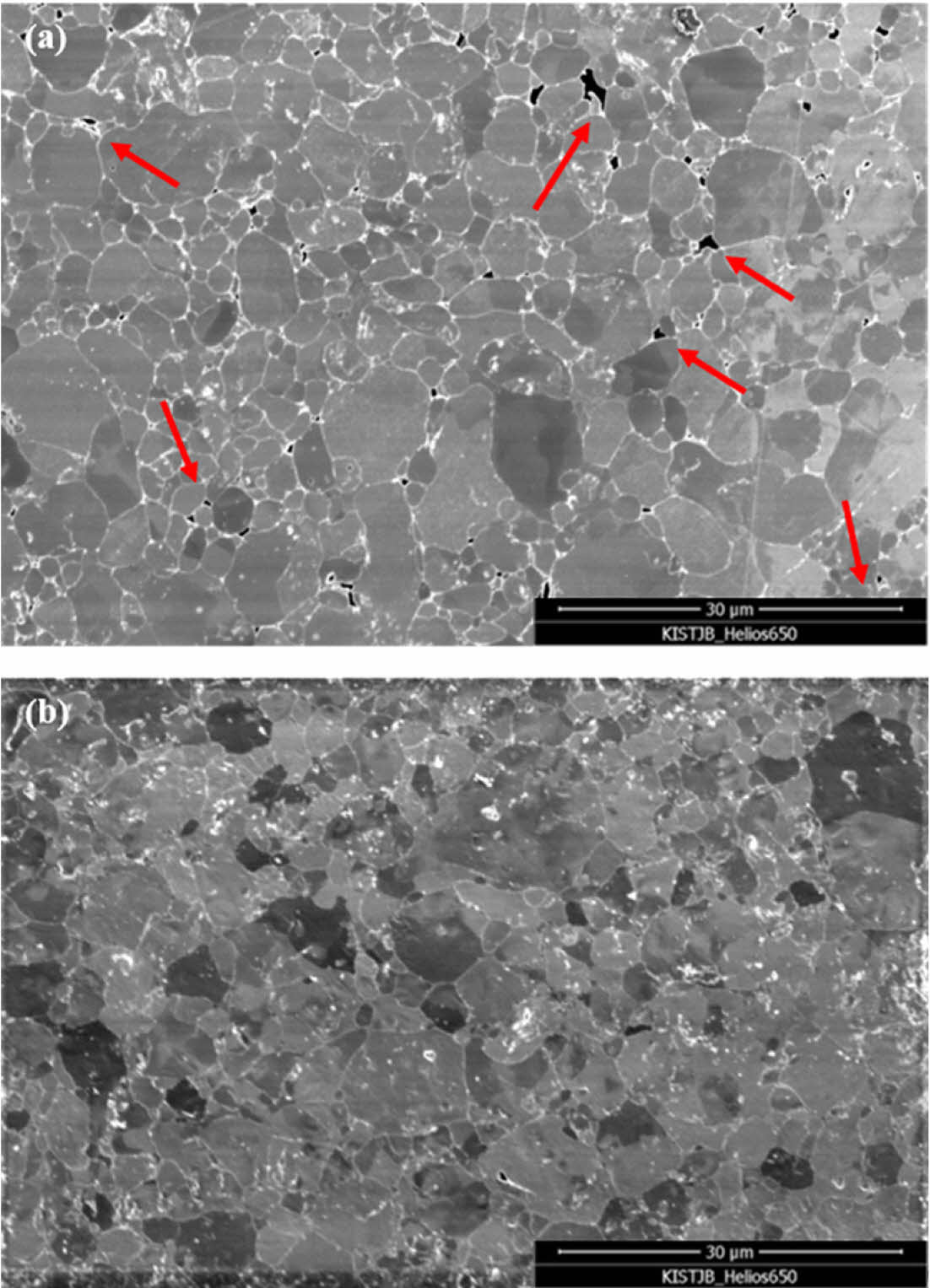 온도에 따른 순수 알루미늄 소결체의 표면을 주사전자현미경으로 분석하여 차이를 확인하였다. Fig. 5(a)는 570oC, Fig. 5(b)는 630oC의 순수 알루미늄 소결체의 표면을 분석한 결과이다. Fig. 5(a)는 알루미늄 입자 간의 소결이 진행되지 않아 공극이 존재하는 것을 확인하였다. 이에 반해 Fig. 5(b)는 공극이 존재하지 않는 것을 확인하였다. 이를 통해 온도가 증가함에 따라 소결이 원활하게 이루어져 입자 간의 공극이 감소하는 것을 확인하였다. 이는 앞선 소결 온도가 증가함에 따라 열전도도가 증가하는 결과를 뒷받침한다.