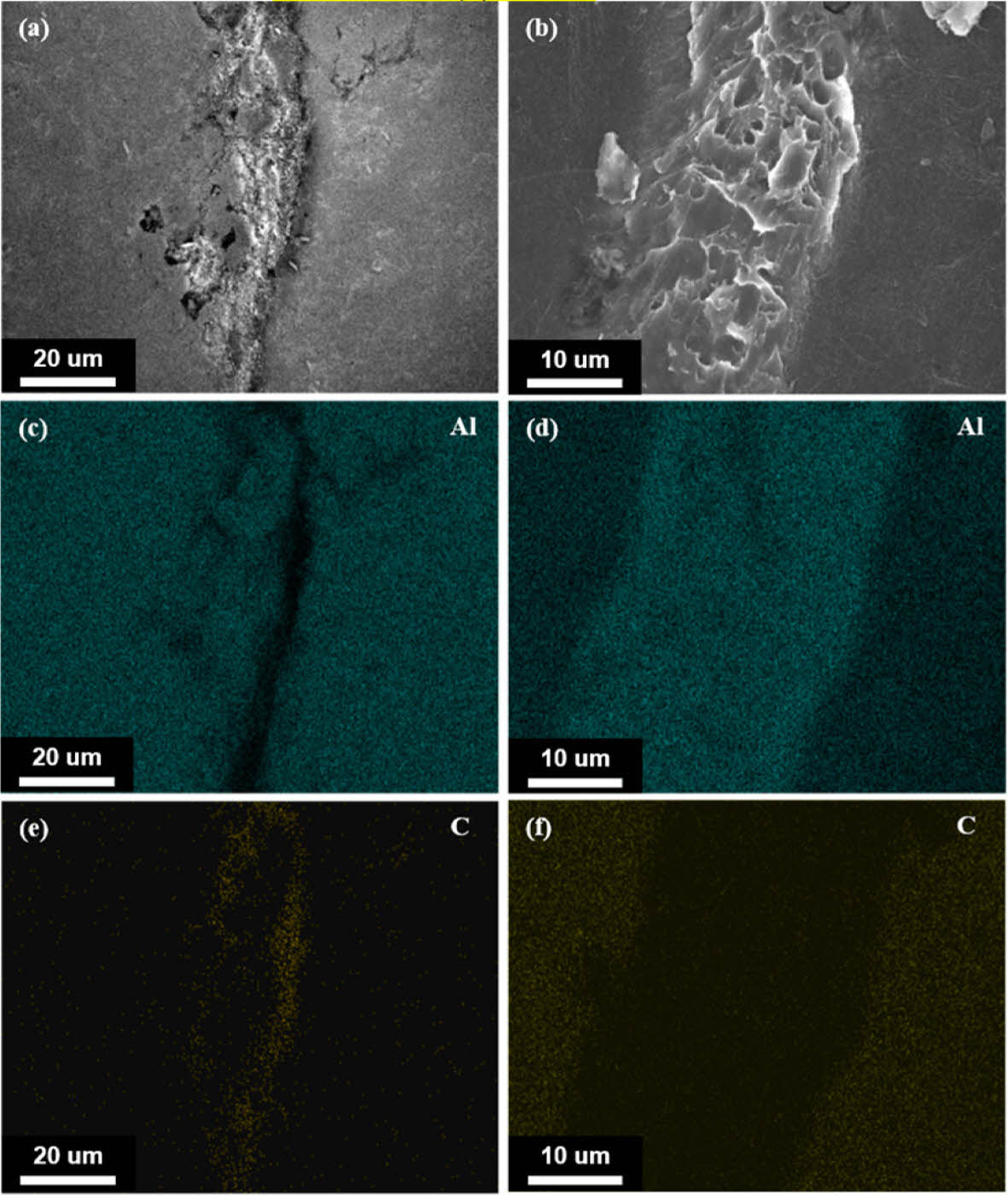 Fig. 6 (a), (c), and (e) SEM and EDS images of the aluminumCNT composite using non-plasma-treated CNT sheets, (b), (d), and (f) SEM and EDS images of the aluminumCNT composite using plasma- treated CNT sheets |