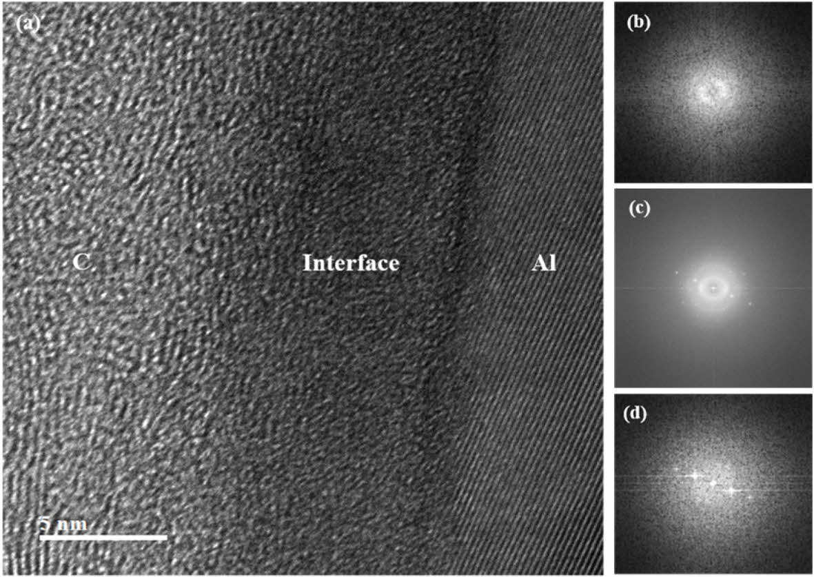 Fig. 7 (a) TEM image of the interface between aluminum and a carbon nanotube, (b) FFT pattern in the carbon region, (c) FFT pattern in the interface region, (d) FFT pattern in the aluminum region |
