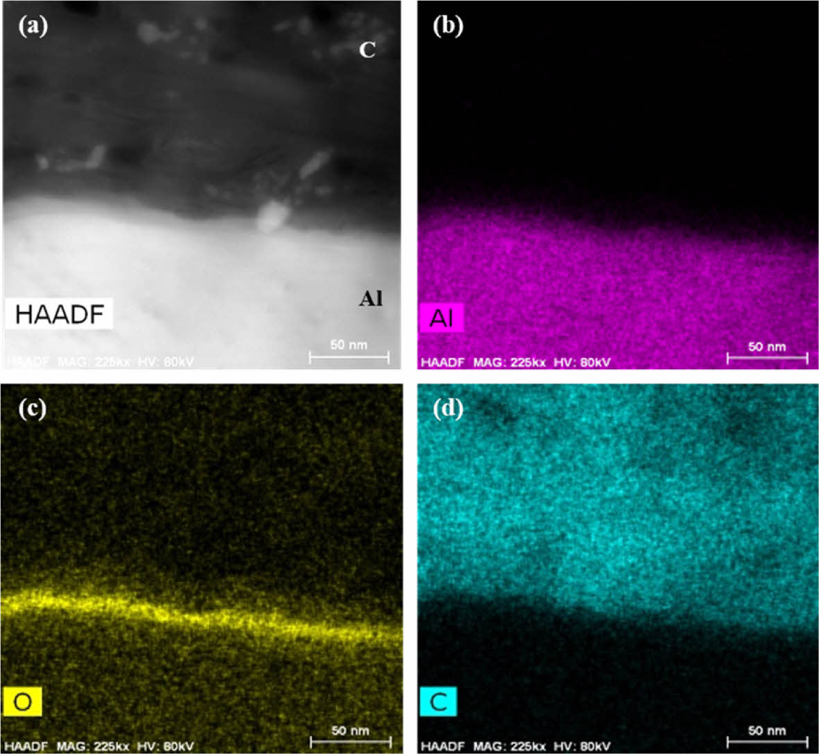 Fig. 8은 630oC에서 소결한 플라즈마 처리된 탄소나노튜브 시트를 이용하여 제조된 알루미늄 복합재를 주사투과전자현미경으로 분석한 결과이다. Fig. 8(a)는 High angle annular dark-field(HADDF) 이미지로 알루미늄과 탄소나노튜브 층 사이에 contrast 차이가 존재하는 중간층이 형성된 것을 확인하였다. 에너지 분산 X선 분광법을 통해 추가적인 분석을 진행하고 Fig. 8(b), (c), (d)의 결과를 얻었다. Fig. 8(b), (d)는 각 영역에서 탄소와 알루미늄 원소가 검출되는 것을 나타낸다. Fig. 8(c)를 통해 중간 층 영역에 산소 원소가 검출되는 것을 확인하였다. Fig. 8(c)는 앞선 산소 플라즈마 처리에 의해 형성된 산소 관능기가 탄소나노튜브의 결합에 직접적인 영향을 끼치는 결과를 뒷받침한다.