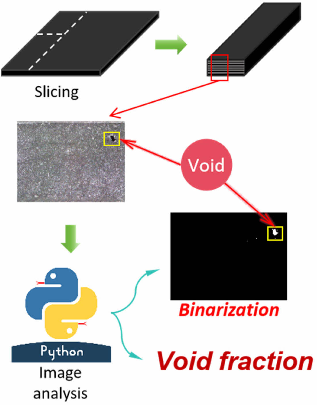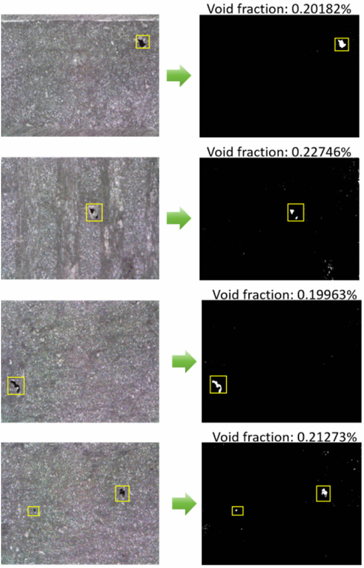 The integration of AI-based image processing enhances the accuracy and efficiency of void fraction analysis. The Python-based approach automates image preprocessing, thresholding, and segmentation, minimizing human bias in void detection. Unlike traditional characterization techniques, the AI-assisted method not only quantifies void content but also correlates it with processing parameters, facilitating real-time optimization. This predictive capability is a distinct advantage over conventional methods, which are primarily used for post-process quality assessment rather than proactive optimization.