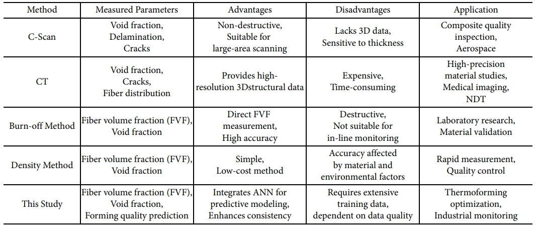 However, the production of GFRTP with consistent quality presents several challenges, particularly in controlling void formation and fiber alignment during thermoforming. The manufacturing process must balance key factors such as cost, safety, and processing time to ensure efficiency and product reliability. The comparison between different characterization methods are listed in Table 1. Optimizing these factors is critical to reducing material waste, enhancing mechanical performance, and improving the scalability of production for industrial applications.