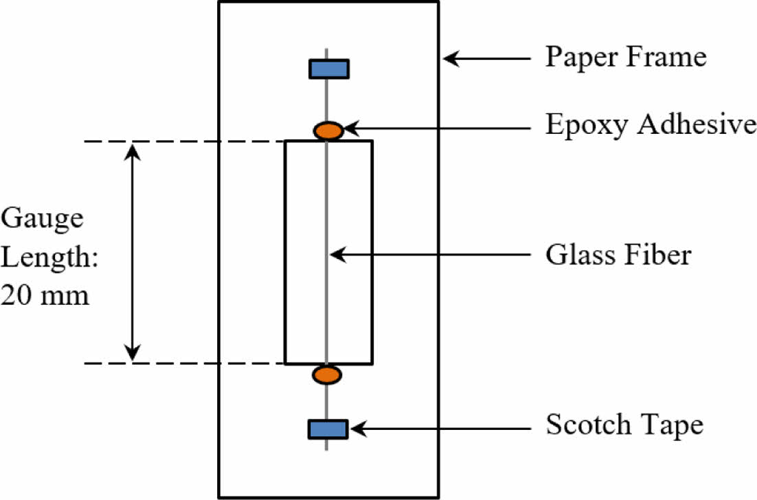 유리섬유 단섬유의 인장강도를 측정하기 위해 Fig. 1과 같이 측정 길이를 20 mm 간격으로 설정하고, 2액형 에폭시로 고정하여 제작하였다.