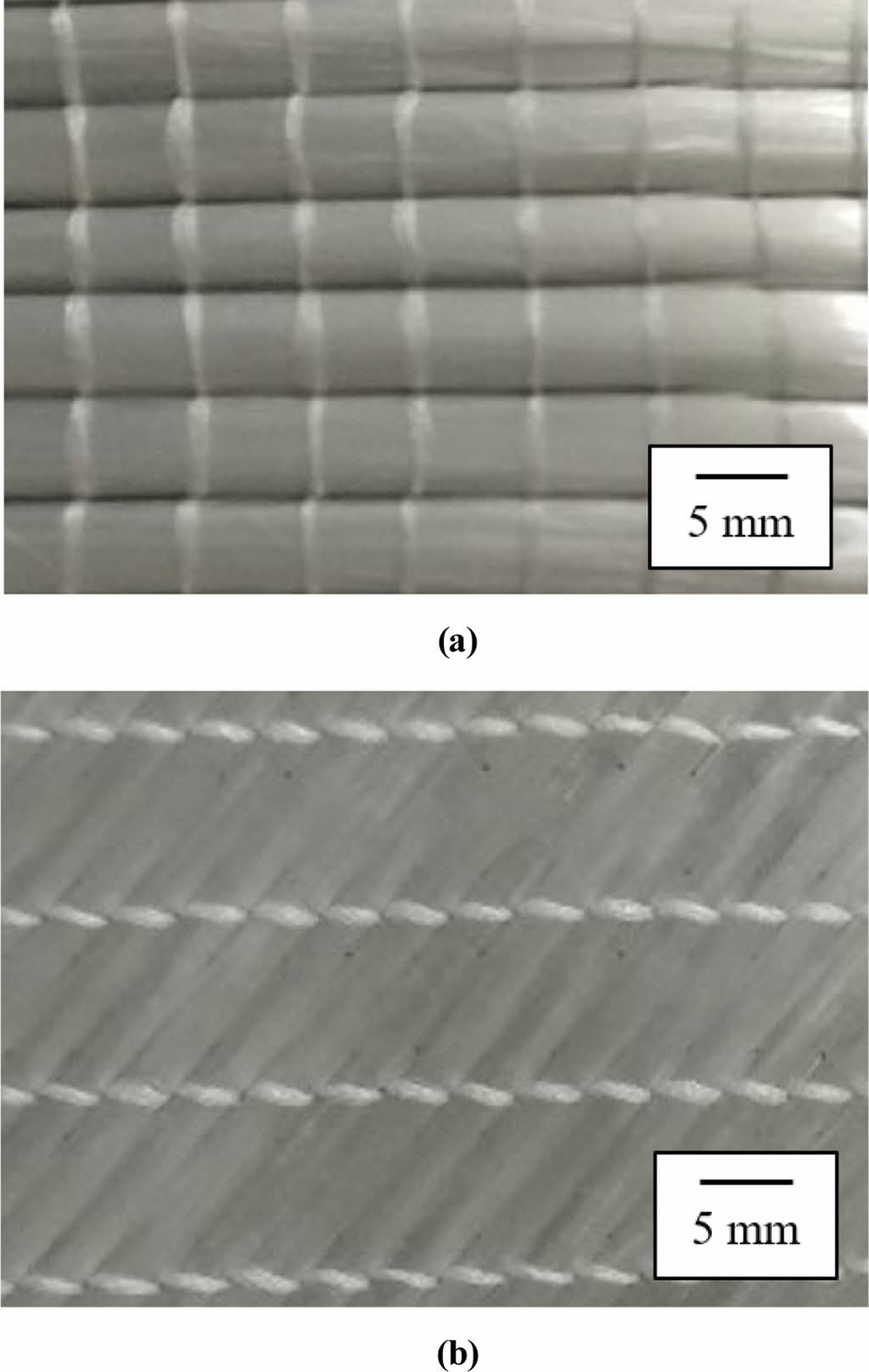 Fig. 2 Stitch patterns of glass fabrics: (a) 90o ; and (b) 45o |