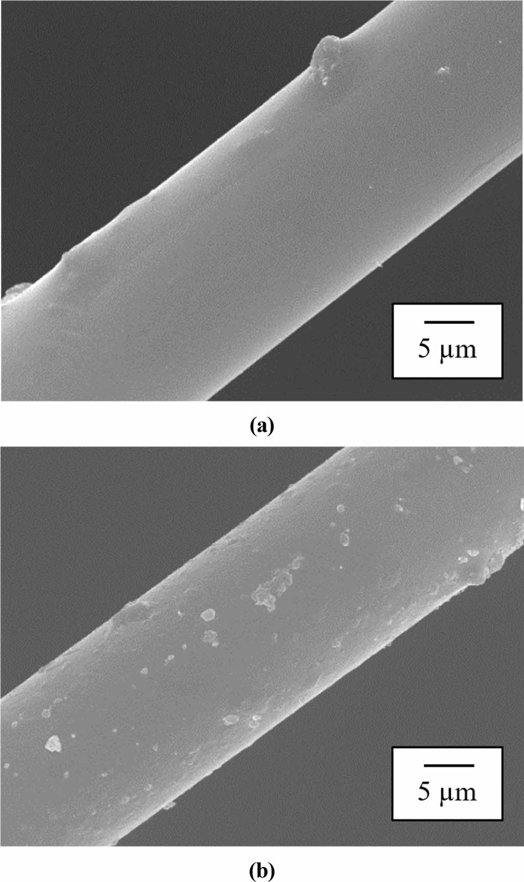 Fig. 3 FE-SEM images of glass fibers: (a) from 90o fabric; and (b) from 45o fabric |
