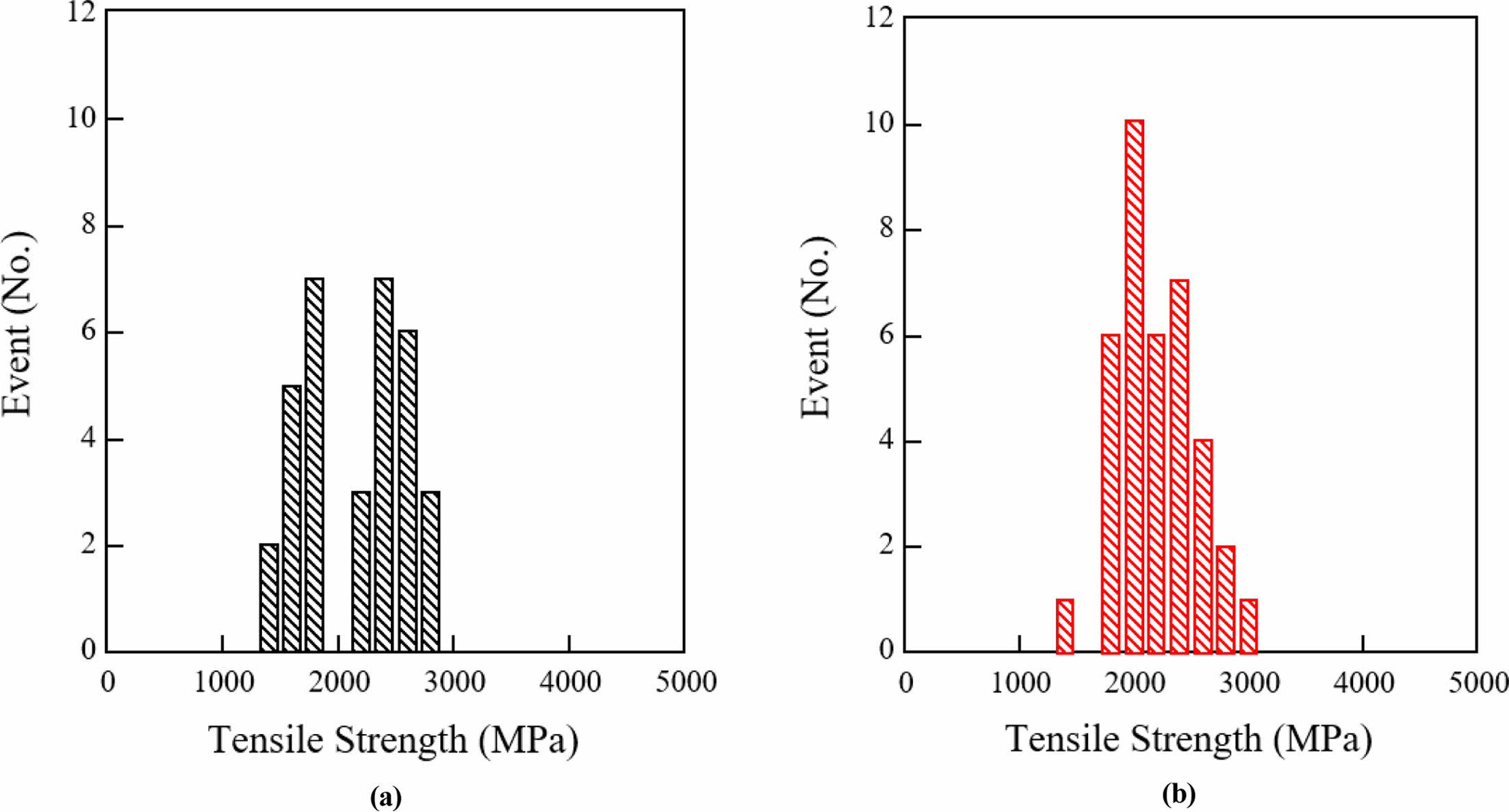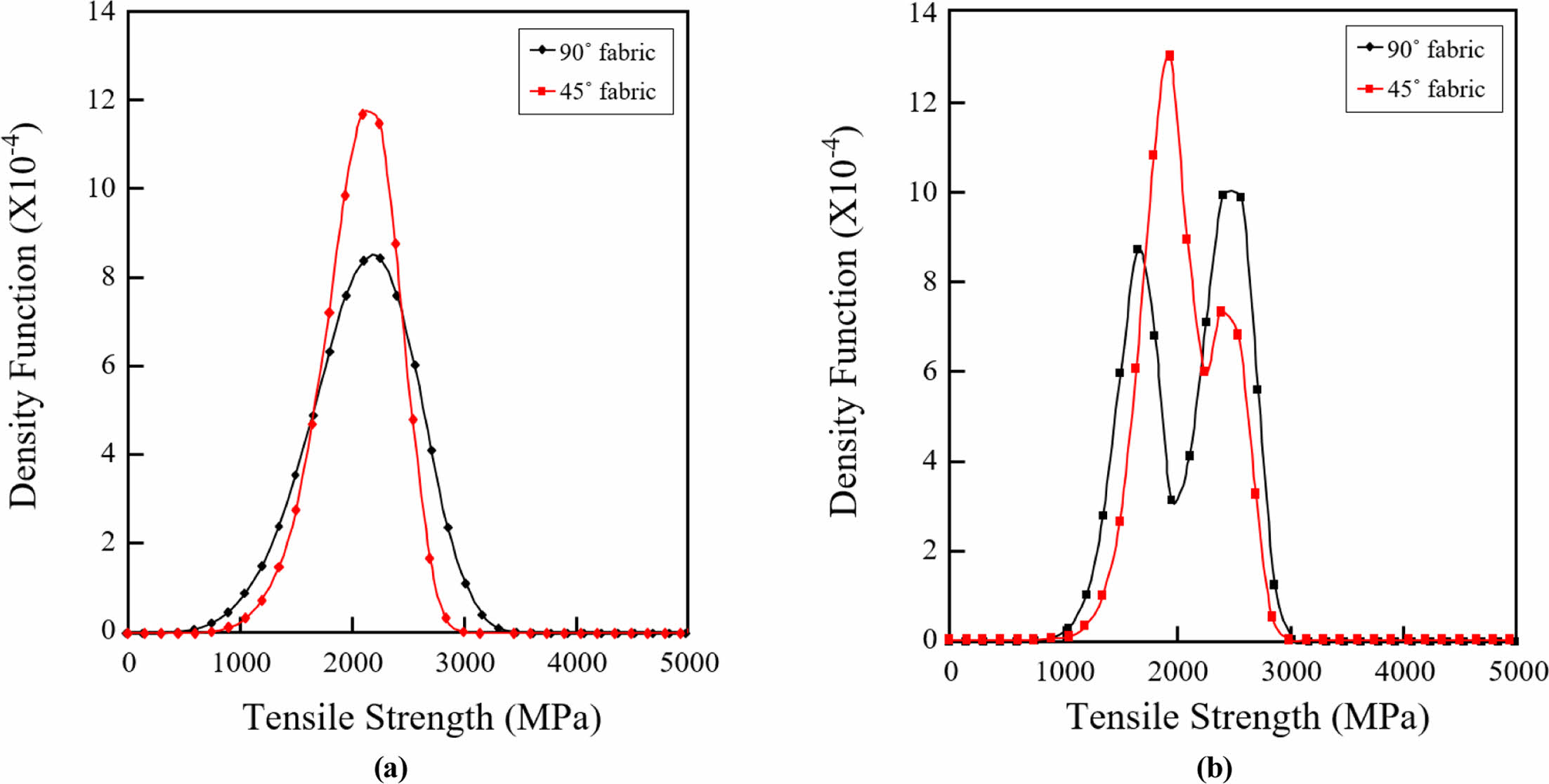 Fig. 5 Statistical analysis of glass fiber tensile strength: (a) from 90o fabric; and (b) from 45o fabric |