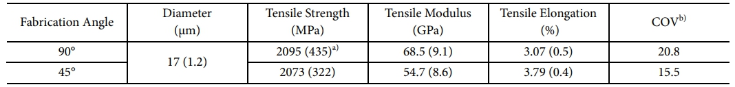 Fig. 3은 각 직물에서 유리섬유 한 가닥을 채취하여 FE-SEM으로 확대 관찰한 사진이다. 90o로 고정된 직물로부터 채취한 유리섬유 표면의 경우 손상 빈도가 낮은데 반해 손상의 크기는 큼을 확인하였다. 한편 45o로 고정된 직물로부터 채취한 유리섬유 표면의 경우 손상 빈도는 높은데 반해 손상의 크기는 작음을 확인하였다. 이는 스티치의 고정 빈도 및 세기에 따라 유리섬유 표면에 영향을 미쳤을 것으로 판단된다.