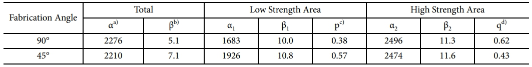 여기서 α와 β는 척도모수 및 형상모수이다. p와 q는 낮은 인장강도 분포와 높은 인장강도 분포를 나타내며, 각 분포에 대한 척도모수 및 형상모수를 1, 2번으로 각각 나타내었다[10-13].