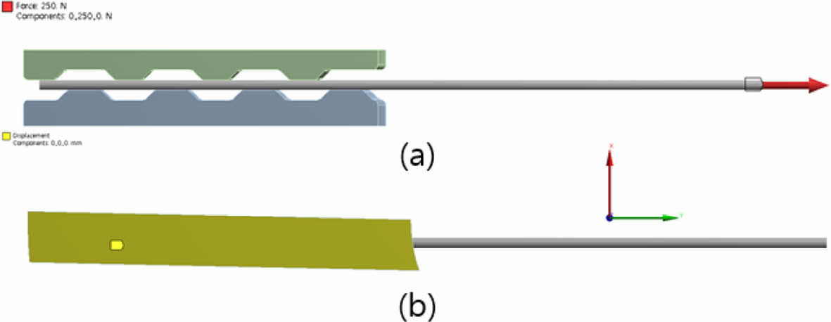 Fig. 9 (a) Clamp horizontal displacement, (b) Horizontal fixed condition |