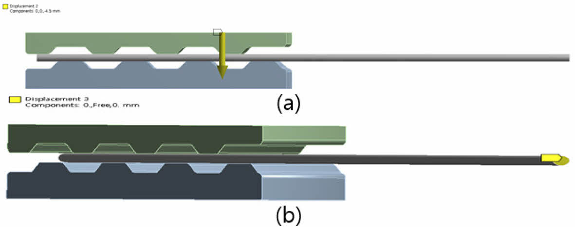 해석의 경계조건은 Fig. 9(b)와 같이 클램프 하부의 모든 방향에 대하여 변위(x, y, z축)를 제어하였다. 클램프 압착 시 와이어 단부의 수직 변위 및 회전 발생을 제어하기 위해 Fig. 10(b)와 같이 와이어 단부의 x와 z축을 제어하였다.