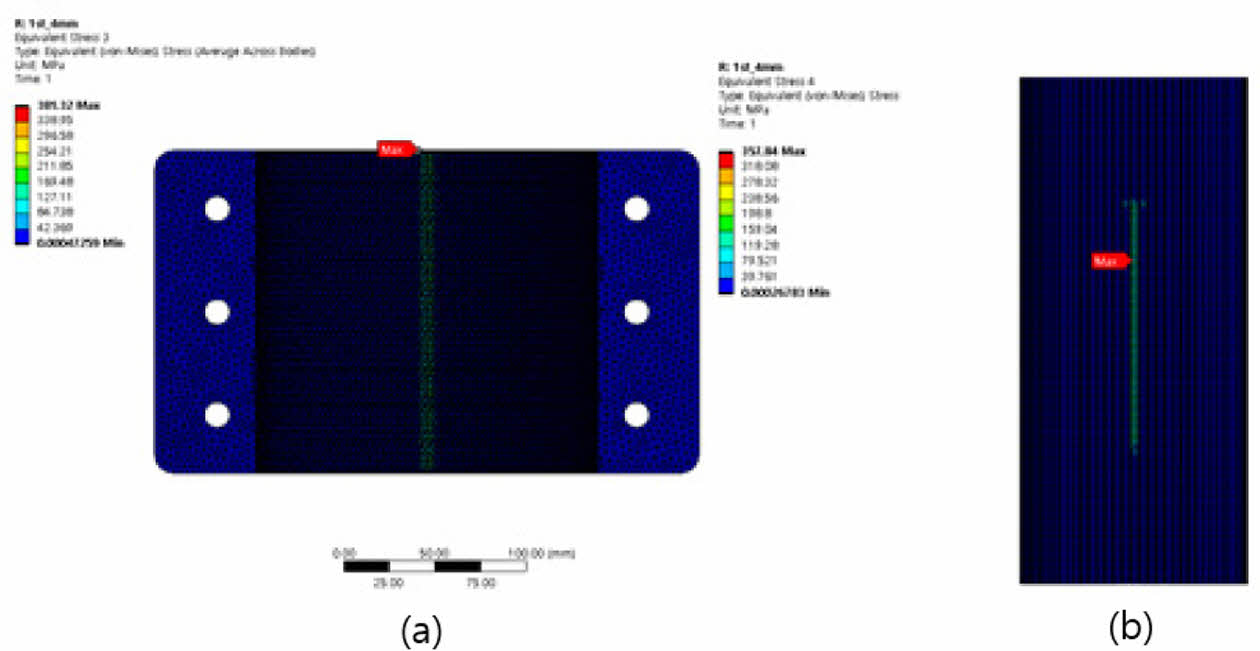 Fig. 16은 해석모델에 발생되는 Von Mises stress 분포를 나타내며 클램프에서는 최대 414.4 MPa, 와이어에서는 최대 881.3 MPa을 보인다. 와이어의 경우 재료의 인장강도 이상의 응력이 발생되는 것을 확인할 수 있다.