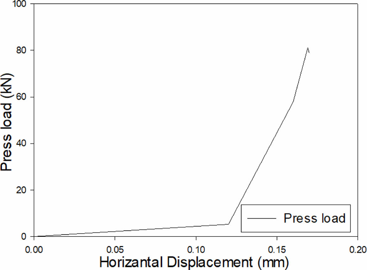Fig. 14은 클램프 체결을 위한 볼트 프리텐션(pretension)을 도출하기 위한 압착하중으로 최대 약 81.3 kN를 보였으며 대칭모델을 고려할 때 두 배인 162.7 kN를 나타낸다. 즉 총 6개의 볼트를 고려하다면 볼트당 약 27.1 kN이 필요한 것을 알 수 있다.