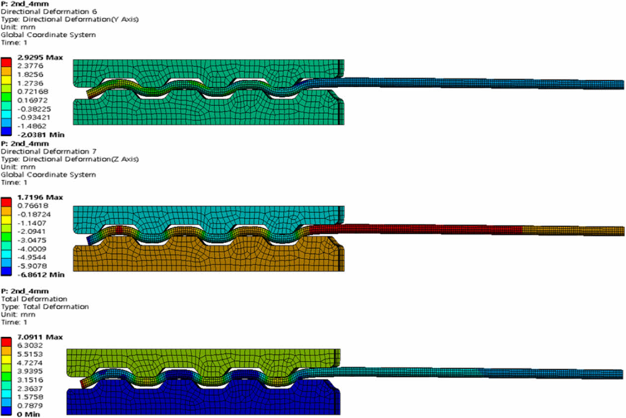변위로 인한 수평, 수직 및 Total 변위 분포의 경우 Fig. 15에서 확인할 수 있다. 특히 Fig. 15(a)에서는 와이어에서 발생되는 수평 변위가 매우 미소한 것을 확인할 수 있다.