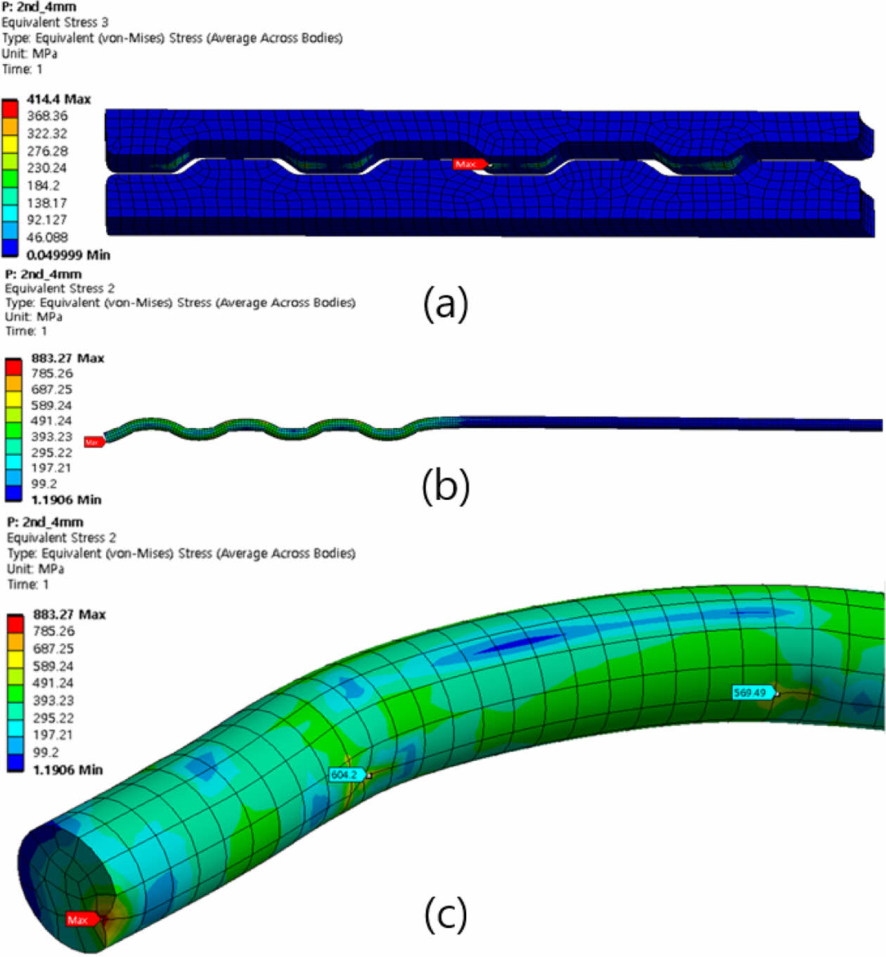 Fig. 16 Von Mises Stress (a) Clamp, (b) Wire, (c) Wire Details |