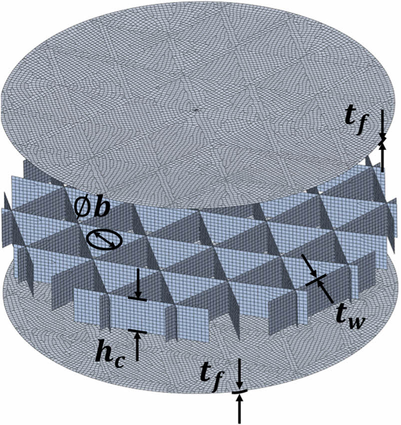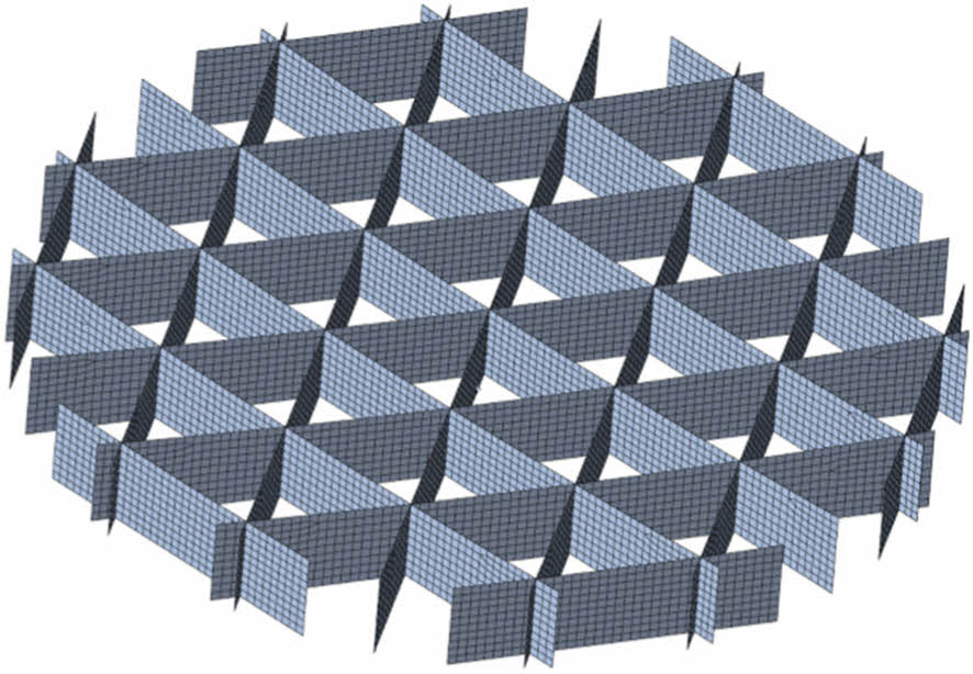 이러한 특성으로 인해, 반사경은 두 개의 패널과 하나의 그리드 코어로 구성된 그리드 보강 구조를 채택하였다. 일반적으로 그리드 보강 구조는 삼각형, 사각형, 육각형과 같은 패턴을 활용한다. 비구면 반사경의 경우 곡면 형상으로 인한 설계 복잡성으로 육각형 패턴을 적용하는 데 어려움이 있다. 반면, 삼각형 패턴은 육각형 패턴에 비해 제작이 용이하며, 사각형 패턴보다 우수한 측면 강성을 제공하는 것으로 알려져 있다[20]. 따라서 반사경과의 호환성을 고려하여, 그리드 보강 코어는 Fig. 1과 같이 삼각형 패턴을 적용하였다.