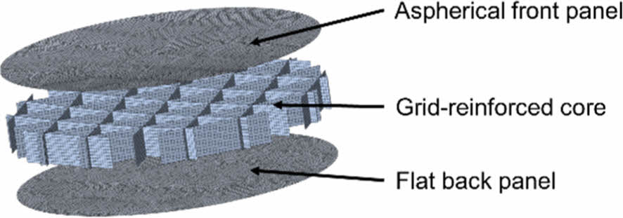 탄소 섬유 복합재는 벌크 형태로 제조하기 어려워 반사경 설계에서는 얇은 프리프레그 층을 적층하는 방식이 주로 사용된다. 이때, 구조적 강성과 열 변형 안정성을 확보하기 위해 허니콤 코어 샌드위치 구조나 그리드 보강 구조가 적용된다. 허니콤 코어 샌드위치 구조는 높은 강성을 제공하고 열 변형을 최소화하는 장점이 있으며[18], 그리드 보강 구조는 샌드위치 구조뿐만 아니라 오픈백 구조에도 활용될 수 있다. 특히, 상하 패널과 중간 지지체 모두에 탄소 섬유 복합재를 사용하면, 패널과 지지체 간 열팽창 계수 차이를 제거할 수 있다. 또한, 허니콤 구조와 비교했을 때 그리드 보강 구조는 강성 분포가 균일하며, 허니콤 구조에서 발생할 수 있는 평면 외 왜곡 문제를 효과적으로 방지할 수 있다[19].
