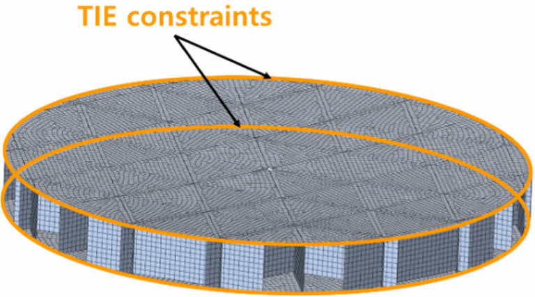 비구면 반사경의 유한요소 모델은 NX UG를 사용하여 모델링하고, Hypermesh를 이용해 메쉬 처리되었다. 유한 요소해석은 Optistruct에서 수행되었다. 적층을 모델링하기 위해 CQUAD8 요소가 사용되었다. 메쉬 수렴성을 평가한 후, 요소 크기는 2mm로 선정하였다. 초기 모델은 34,936개의 요소와 104,468개의 절점으로 구성된다. Fig. 4에 나타난 바와 같이, 패널과 그리드 강화 코어 사이에는 TIE 제약 조건이 적용되었다.