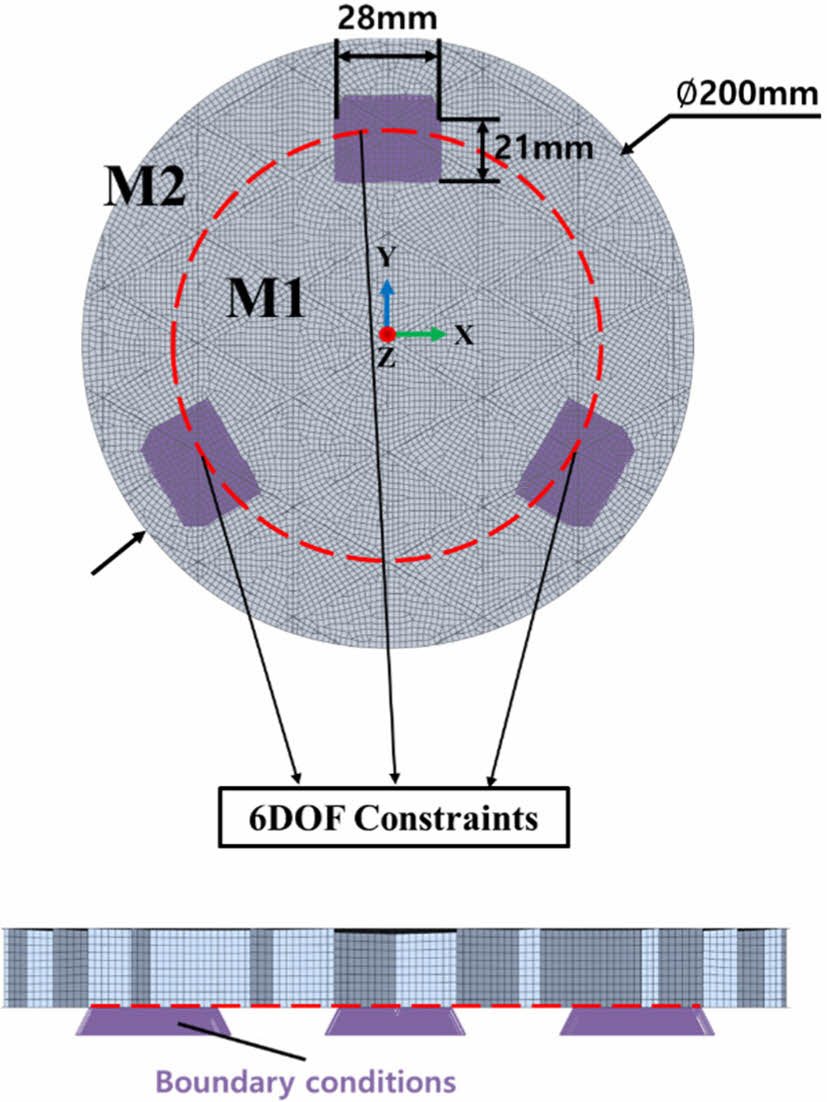 반사경의 정밀한 위치 제어와 설치 또는 열 응력에 대한 표면 형상 정확도를 유지하기 위해 6자유도의 엄격한 제약이 필요하다[16]. 비대칭을 최소화하고 자중으로 인한 변형을 줄이기 위해, Fig. 5에 나타낸 바와 같이, 반사경의 내부 부분(M1)과 외부 부분(M2)의 질량이 동일할 때, Flexure가 M2의 외접원을 따라 장착된다. 반사경의 후면 패널에는 세 개의 Flexure가 원주 방향으로 대칭적으로 배치된다. Flexure 부착 영역의 크기는 28mm × 21mm로 지정된다.