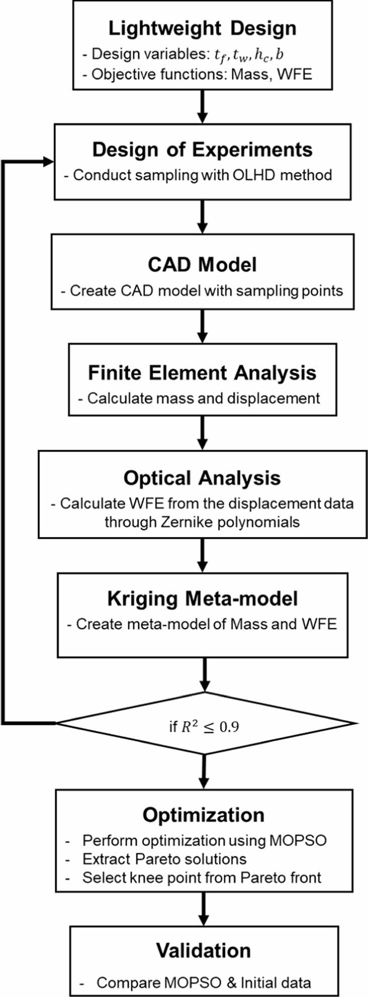 직경 200mm 탄소 섬유 복합재 비구면 반사경의 최적화 과정은 Fig. 6과 같다. 먼저 설계 변수를 정의한 후, 특성 값을 도출하기 위해 최적설계의 정식화를 진행하고 실험계획법을 통하여 실험점을 생성한다. 그 후 크리깅 방법을 사용하여 메타모델을 생성한다. 메타모델의 R2 값이 0.9 이상에 도달하면 MOPSO 알고리즘을 사용하여 파레토 기반의 최적화를 수행하여 최적해를 얻는다.