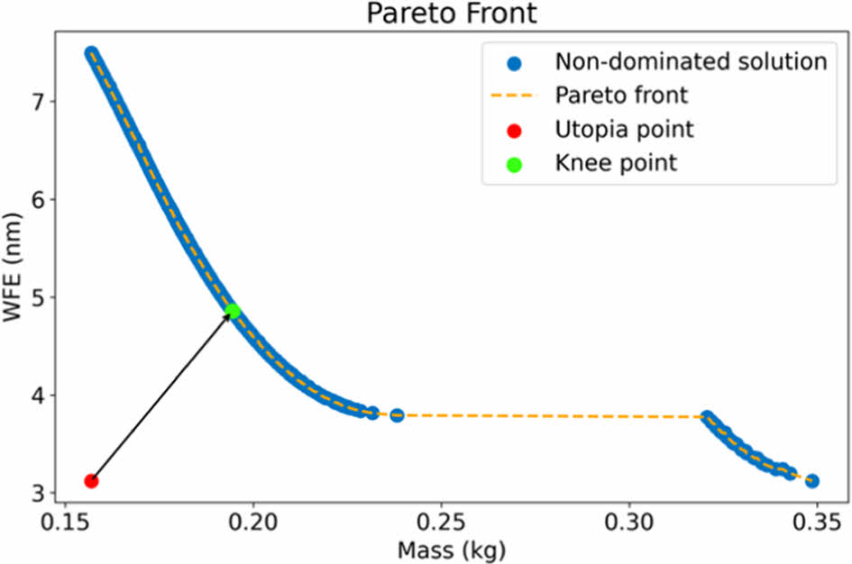 최적화는 MOPSO를 사용하여 질량과 WFE를 동시에 최소화하기 위해 파레토 프론트를 도출하는 방식으로 수행되었다. 결과를 정규화하여 유토피아 점에 가장 가까운 무릎점을 도출하였으며, 이는 Fig. 8과 Table 4에 나타나 있다.