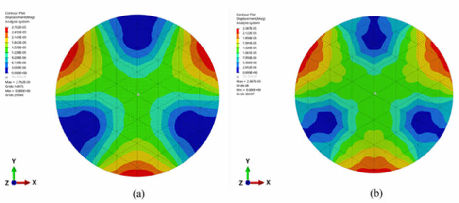 Fig. 9 FEA result of displacement under 1G gravity: (a) Initial model, (b) Knee point model |