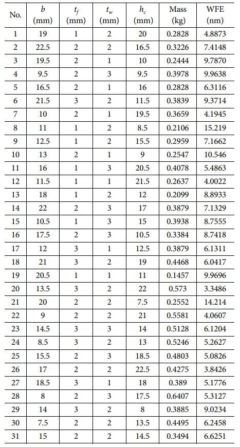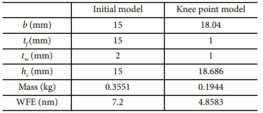 Table 4는 위의 초기 모델과 무릎점 모델의 비교 결과를 나타내며, 무릎점 모델이 초기 모델과 비교하여 질량과 WFE를 모두 감소시키는 데 성공했음을 보여준다. 구체적으로, 질량은 약 45.3% 감소하였으며, WFE는 약 32.5% 감소하였다. 설계 변수의 경우, 반사경의 직경을 유지하면서 질량을 줄이기 위해 그리드와 패널의 두께는 얇아지고, 반사경의 높이와 그리드 내접원 직경이 증가하는 방향으로 최적화된 것으로 판단된다.
