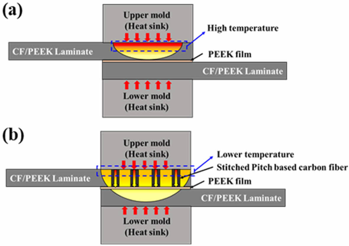 Fig. 1 Schematic of conduction welding in CF/PEEK composites: (a) Conventional configuration and (b) Enhanced heat transfer configuration with pitch-based carbon fiber stitching |