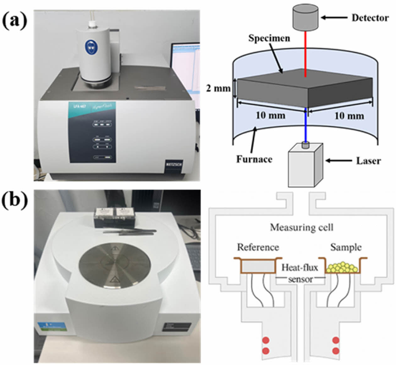 Fig. 4 (a) Laser flash analyzer and its measurement principle for thermal diffusivity and (b) DSC equipment and its measurement principle for specific heat |